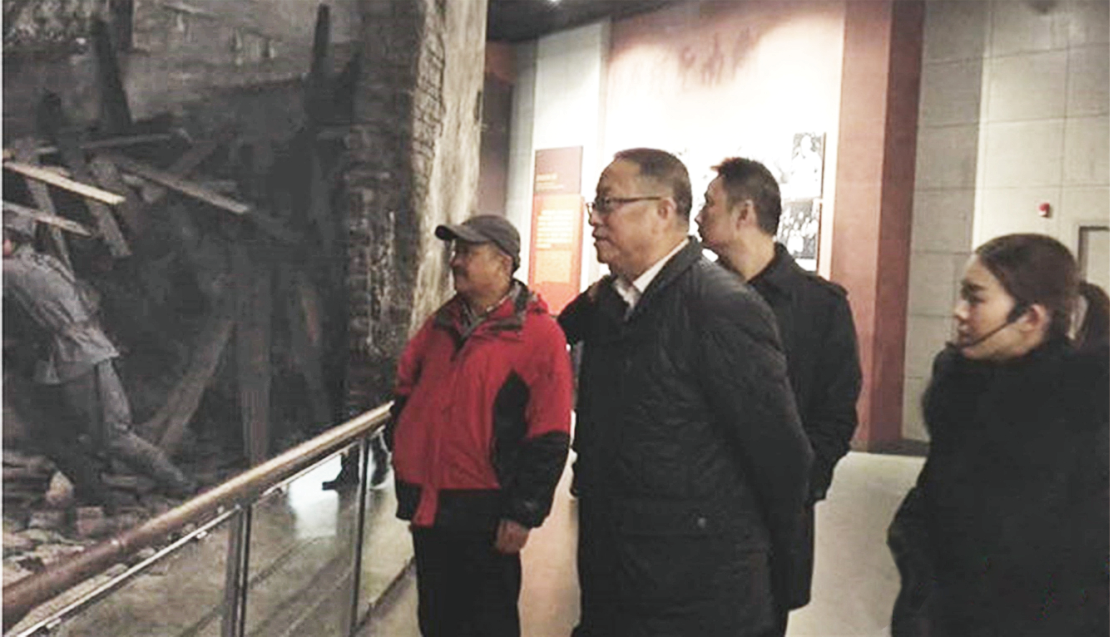 湖南炎德文化實(shí)業(yè)有限公司董事長(zhǎng)何譽(yù)軍(左一)陪同十四屆全國(guó)人大常委會(huì)副委員長(zhǎng),民革中央主席鄭建邦(左二)參觀湖南抗戰(zhàn)紀(jì)念館。