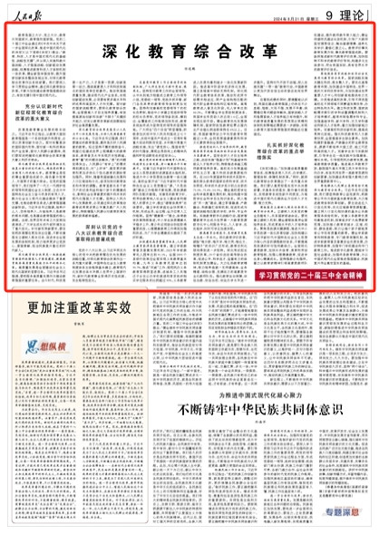 教育是國之大計、黨之大計,教育興則國家興,教育強則國家強。黨的二十屆三中全會通過的《中共中央關(guān)于進(jìn)一步全面深化改革、推進(jìn)中國式現(xiàn)代化的決定》(以下簡稱《決定》)提出:“教育、科技、人才是中國式現(xiàn)代化的基礎(chǔ)性、戰(zhàn)略性支撐”,并從深入實施科教興國戰(zhàn)略、人才強國戰(zhàn)略、創(chuàng)新驅(qū)動發(fā)展戰(zhàn)略,統(tǒng)籌推進(jìn)教育科技人才體制機(jī)制一體改革,健全新型舉國體制,提升國家創(chuàng)新體系整體效能出發(fā),對深化教育綜合改革作出系統(tǒng)部署。我們要深入學(xué)習(xí)貫徹全會精神,通過深化教育綜合改革,不斷為加快建設(shè)教育強國提供動力,有效支撐引領(lǐng)中國式現(xiàn)代化。