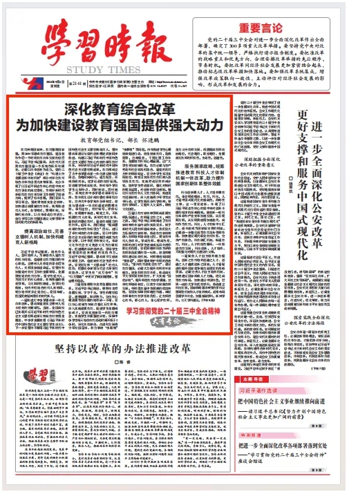 教育興則國家興,教育強則國家強。到2035年建成教育強國,是當前和今后一個時期教育改革發(fā)展的總目標。習近平總書記強調(diào),從教育大國到教育強國是一個系統(tǒng)性躍升和質(zhì)變,必須以改革創(chuàng)新為動力。黨的二十屆三中全會《決定》在“構建支持全面創(chuàng)新體制機制”部分對深化教育綜合改革作出重大決策部署,充分體現(xiàn)了以習近平同志為核心的黨中央對教育事業(yè)的高度重視,為做好新時代新征程教育改革發(fā)展工作指明了前進方向、提供了根本遵循。我們要深入學習領會、堅決貫徹落實全會精神,加快建設高質(zhì)量教育體系,統(tǒng)籌推進育人方式、辦學模式、管理體制、保障機制改革,以改革添動力增活力,奮力書寫以教育強國建設支撐引領中國式現(xiàn)代化的新篇章。