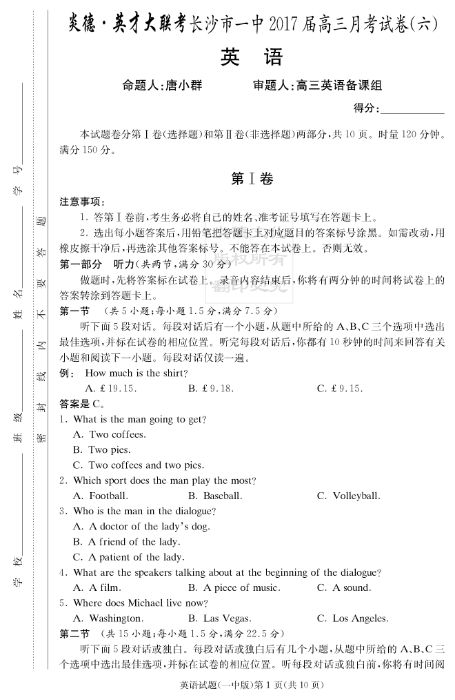 【英語】炎德英才大聯(lián)考2017長沙一中高三6次月考